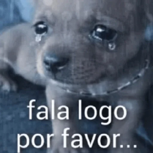 Um cachorrinho com lágrimas nos olhos e uma corrente no pescoço, com o texto 'fala logo por favor...' sobreposto.
