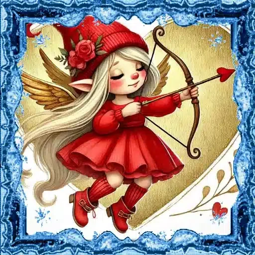 Uma menina fofa com asas de anjo e cabelos loiros longos veste um traje vermelho, incluindo um chapéu com uma rosa, e segura um arco com uma flecha em forma de coração. Ela está em um fundo dourado com um quadro azul decorativo.
