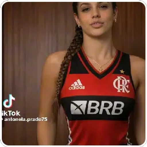 Uma mulher jovem com uma trança lateral longa usando uma camisa de futebol vermelha e preta com o logo do Flamengo, marcas Adidas e BRB, contra um fundo de madeira. Há um logotipo do TikTok no canto.