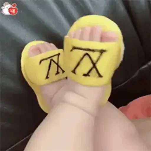 Pés de uma pessoa com chinelos amarelos fofos com símbolo 'TT' e 'XX' bordados em preto. Fundo escuro.