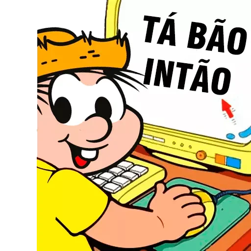 Menino de olhos grandes e sorriso largo, usando uma coroa laranja e uma camisa amarela, sentado em frente a um computador amarelo com o texto 'TÁ BÃO INTÃO' na tela.