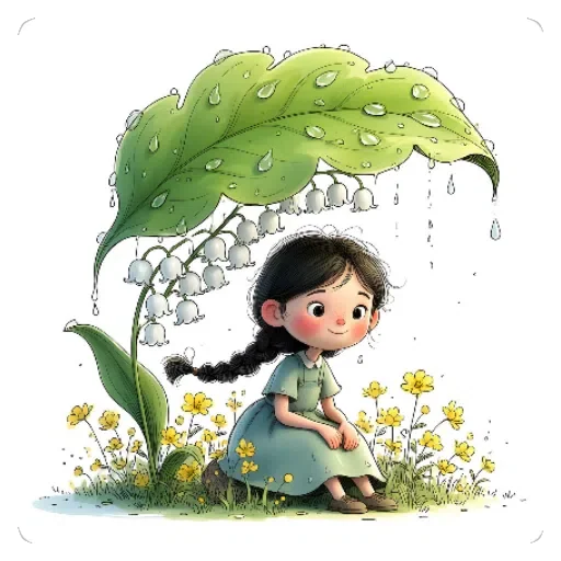 Menina sentada em meio a flores amarelas e capim, com uma grande folha verde acima dela protegendo-a da chuva. Ela tem o cabelo preto em uma trança e veste um vestido verde claro.