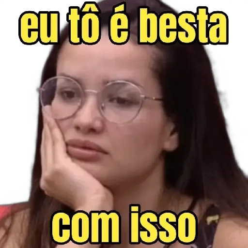 Uma mulher com óculos e expressão de desinteresse ou irritação, com as frases 'eu tô é besta com isso' sobrepostas.