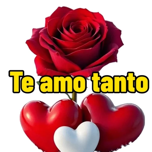 Uma rosa vermelha com três corações vermelhos e um branco, com o texto 'Te amo tanto' em amarelo.