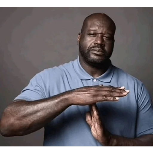 Shaquille O'Neal fazendo um gesto com as mãos, parecendo confiante ou fazendo um sinal, vestindo uma camisa azul.