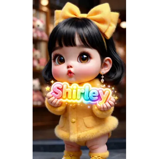 Menina de cabelo preto com franja e um laço amarelo na cabeça, vestindo um casaco amarelo, segura um sinal com o nome 'Shirley' em letras coloridas.