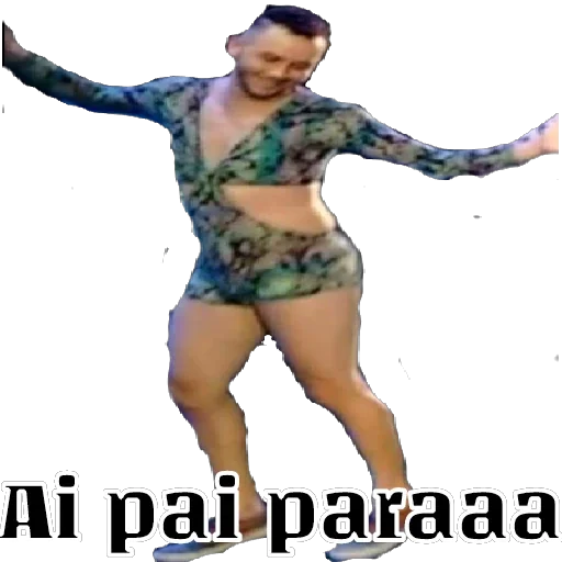 Homem com roupas femininas, blusa e shorts, dançando com os braços abertos. Legenda 'Ai pai paraaa'