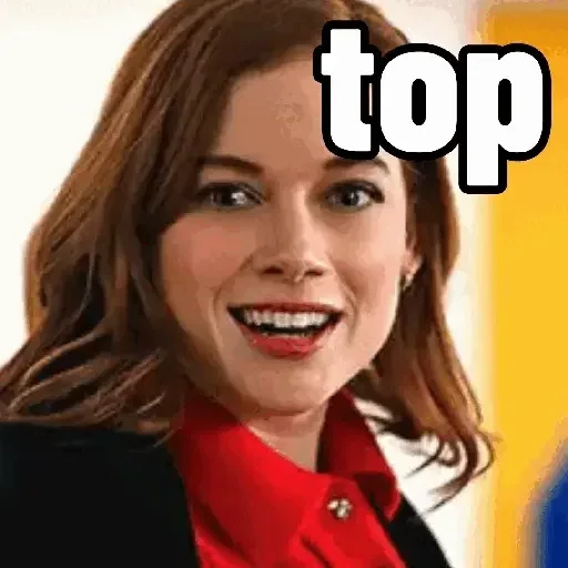 Uma mulher de cabelo castanho e sorriso largo, vestindo um blazer preto e uma camisa vermelha, com o texto 'top' em branco com contorno preto no canto superior direito.