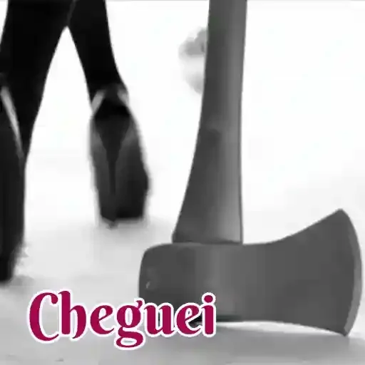 Perna de pessoa em movimento ao lado de um machado, com o texto 'Cheguei' em vermelho.