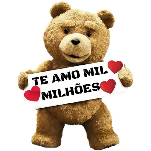 Um ursinho de pelúcia marrom claro com olhos castanhos e um sorriso, segurando um cartaz branco com a frase 'TE AMO MIL MILHÕES' e dois corações vermelhos.
