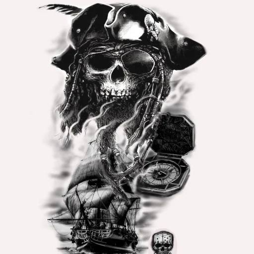 Crânio de pirata com chapéu e faixa, cercado por chamas e desenhos intricados em preto e branco.