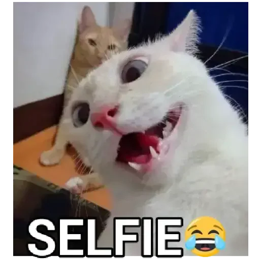 Dois gatos, um branco com expressão engraçada e outro laranja ao fundo. O gato branco tem a boca aberta e olhos arregalados, com o texto 'SELFIE' embaixo.