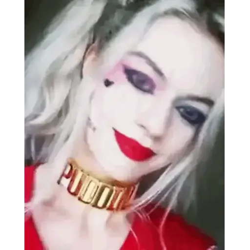 Uma mulher com cabelo loiro, maquiagem colorida e um colar dourado com a palavra 'Puddin'. Ela está usando um vestido vermelho e tem uma expressão facial sedutora.