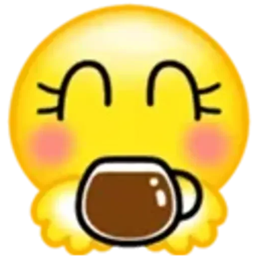 Um emoji amarelo com olhos fechados e uma xícara de café na frente da boca, com bochechas rosadas.