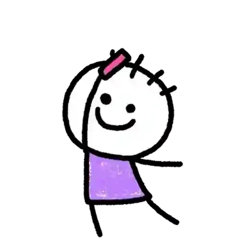 Um desenho simples de uma menina com um sorriso, cabelo rosa e uma blusa roxa.