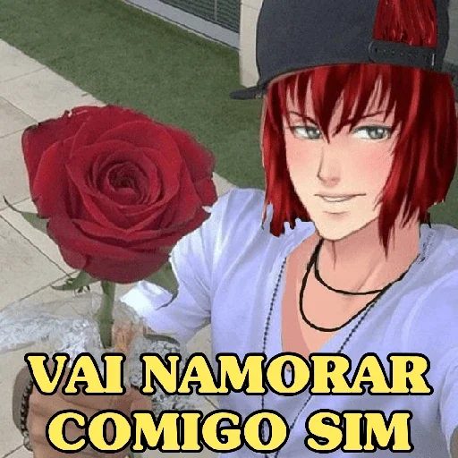 Uma personagem de anime com cabelos vermelhos e um chapéu preto oferece uma rosa vermelha e diz 'Vai namorar comigo sim'.