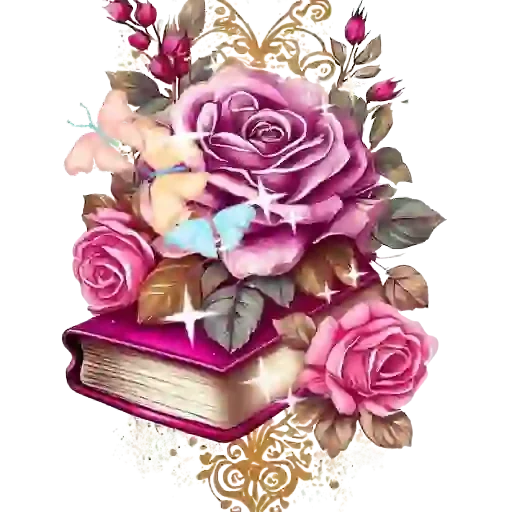Um livro rosa com rosas e folhas ao redor, com um design decorativo dourado e borboletas azuis.