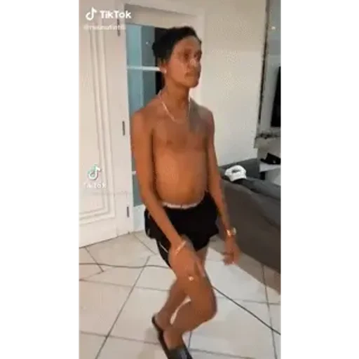 Um jovem sem camisa e de shorts pretos dançando em uma sala com piso de azulejo, ao lado de um sofá e uma porta.