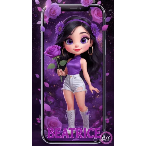 Uma garota de anime com cabelo preto e olhos roxos, vestindo uma blusa roxa, shorts brancos e botas, segura um óculos e está em um fundo roxo com rosas. O nome 'BEATRICE' aparece embaixo.