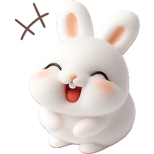Um coelho branco fofinho com olhos fechados e boca aberta, parecendo feliz ou rir. Ele tem duas marcações rosadas nas bochechas e orelhas com detalhes rosados. Há um símbolo de 'X' duplo em marrom no canto superior esquerdo.
