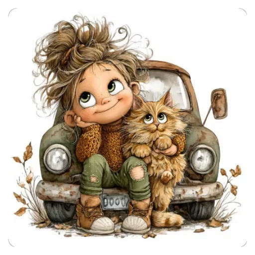 Menina com cabelo castanho e olhos azuis sentada na frente de um carro velho com um gato laranja. Ela está usando roupas verdes e castanhas.