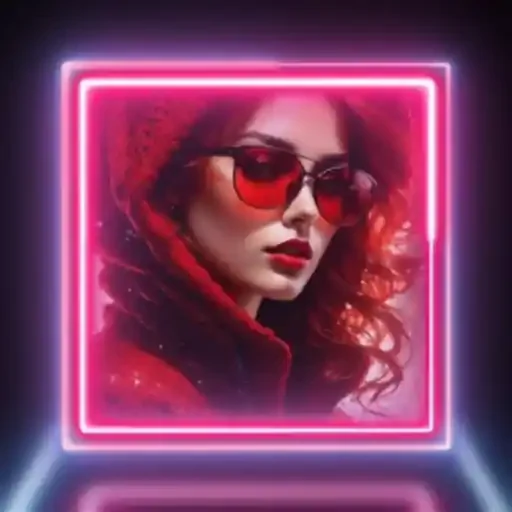 Mulher com óculos de sol vermelhos e cabelo ondulado, emoldurada por um retângulo rosa neon.