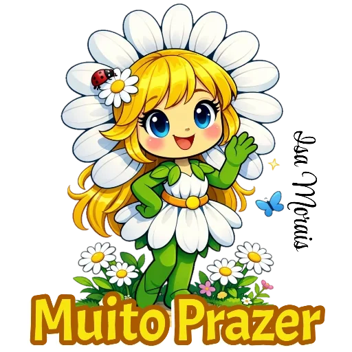 Uma menina de cabelo loiro com uma flor na cabeça e uma saia de pétalas de flor, com o texto 'Muito Prazer' embaixo. Ela tem um sorriso no rosto e uma mão levantada.