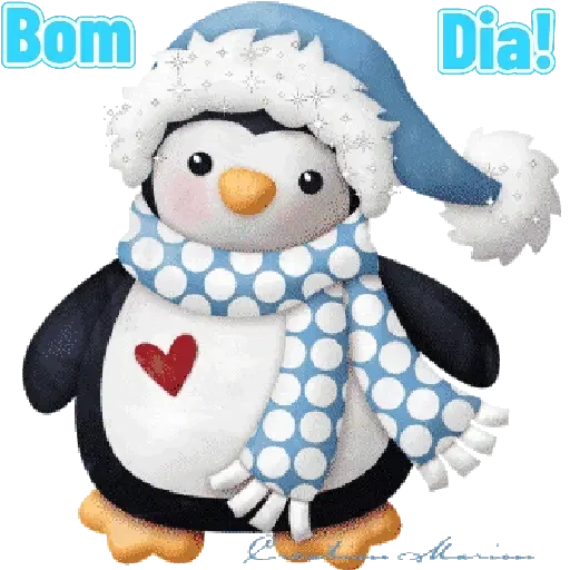 Pinguim vestido com gorro e cachecol, com um coração vermelho no peito. 'Bom Dia!'