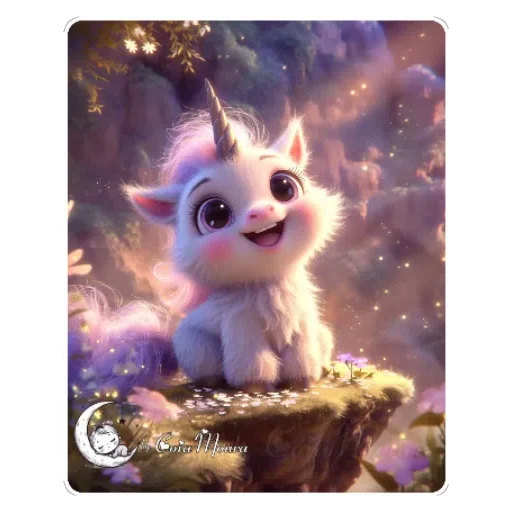 Um unicórnio fofo e branco com chifre e olhos grandes, sentado em uma pedra com musgo, em um cenário mágico com luzes e cores pastel.
