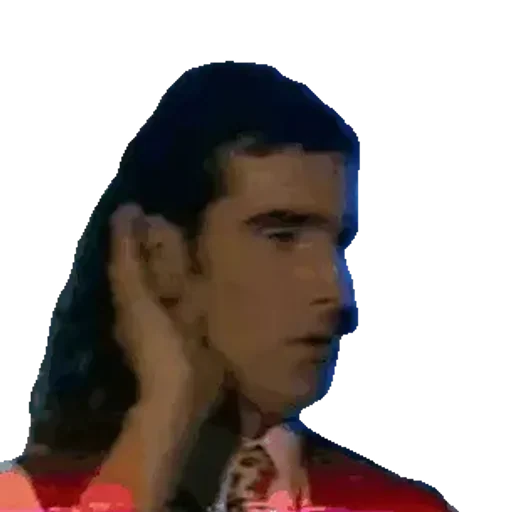 Homem com cabelo preto e camisa vermelha fazendo um gesto com a mão perto do ouvido, parecendo ouvir algo.