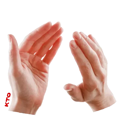 Duas mãos com as palmas para cima e dedos afastados, uma com a inscrição 'KTO' em vermelho.