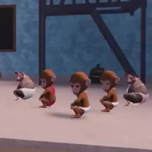 Cinco macacos fofos com diferentes expressões faciais e roupas coloridas estão agachados em uma linha, em um ambiente com parede azul e um quadro na parede.