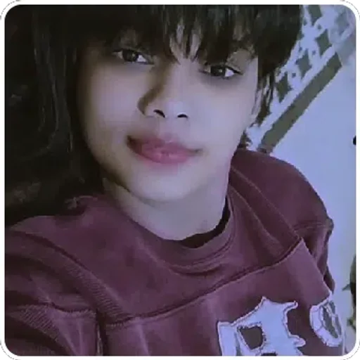 Menina com cabelo castanho e franja, vestindo uma blusa roxa com letras brancas, fazendo uma expressão facial relaxada.