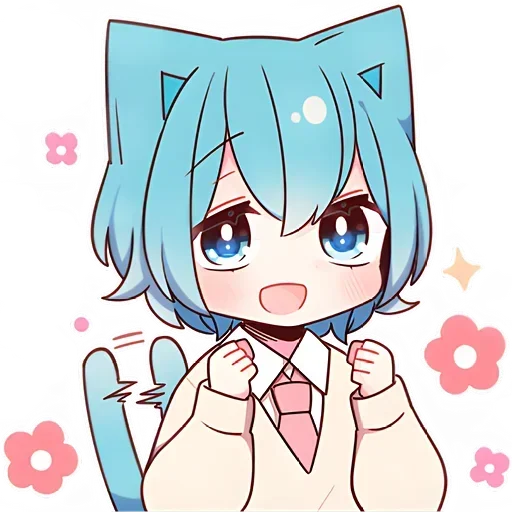 Garota de anime com cabelo azul e orelhas de gato, vestindo um suéter bege e gravata rosa, com flores rosa ao redor.