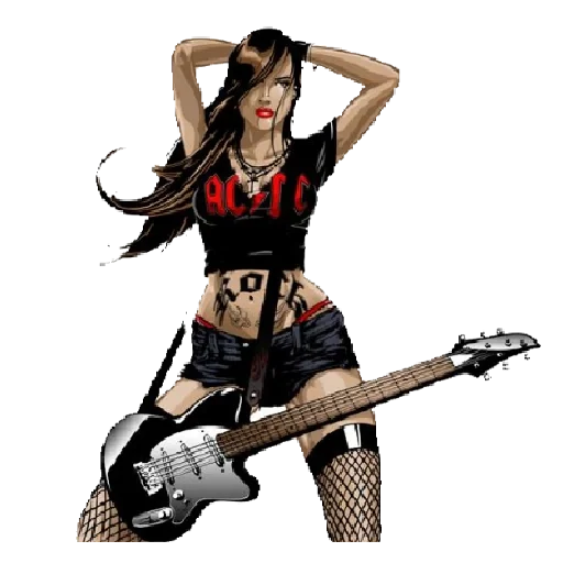 Uma mulher com cabelo preto e laranja, vestindo um top preto com letras vermelhas, shorts e meia-arrastão, segura um violão elétrico prateado enquanto posa com as mãos no cabelo.