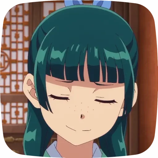 Garota de anime com cabelos verdes escuros e olhos fechados, parecendo feliz ou sonhando.
