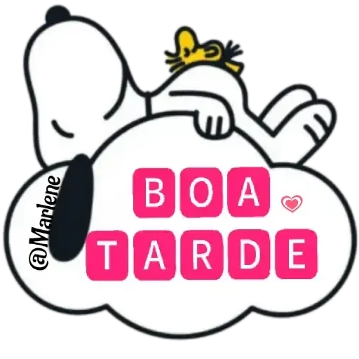 Um desenho do Snoopy e do Woodstock abraçados, com a frase 'BOA TARDE' em letras brancas dentro de quadrados rosa sobre uma nuvem. O Snoopy tem um olho fechado e o Woodstock está em cima dele.