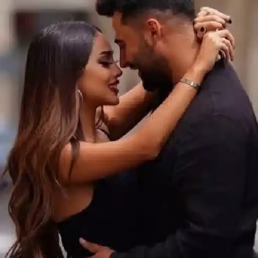 Um casal se abraçando, com a mulher passando os braços pelo pescoço do homem. Ambos estão vestidos de preto.