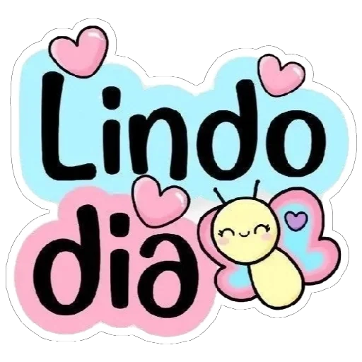 Um desenho de uma borboleta amarela com asas rosa e azuis e corações, ao lado da frase 'Lindo dia'.