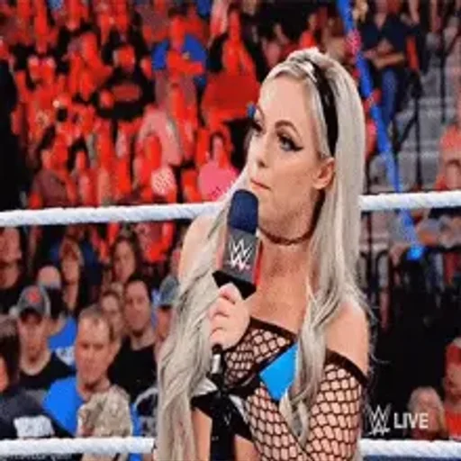 Mulher loira falando ao microfone em um ringue de luta livre, com plateia ao fundo. Ela veste uma roupa preta com rede e tem um cabelo loiro longo.