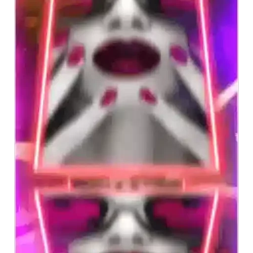 Rosto de uma mulher com boca aberta e olhos arregalados, fundo roxo e neon rosa.