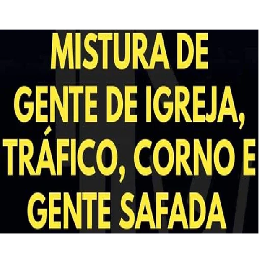 Um retângulo preto com texto em amarelo que diz 'MISTURA DE GENTE DE IGREJA, TRÁFICO, CORNO E GENTE SAFADA'.