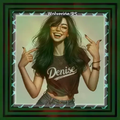 Uma jovem mulher com cabelo preto longo e um sorriso, fazendo caretas e mostrando os dedos indicador, vestindo uma camiseta marrom com o nome 'Denise' em branco. Ela está cercada por uma moldura decorativa.
