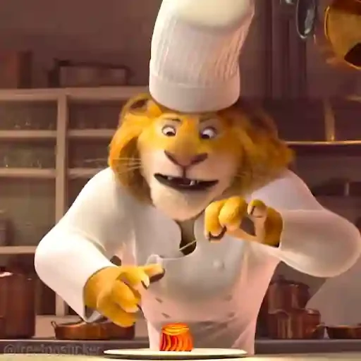 Um leão cartoon usando um chapéu de chef e um jaleco branco prepara uma sobremesa em uma cozinha.
