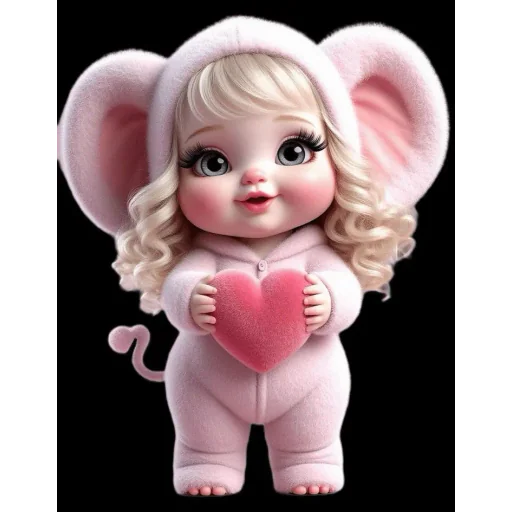 Menina fofa vestida de rato cor-de-rosa segurando um coração vermelho.