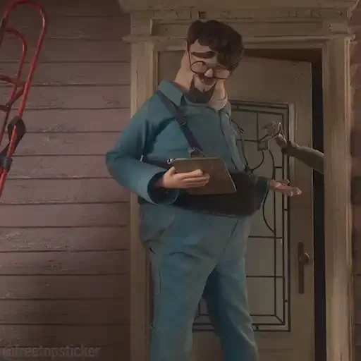 Homem de macacão azul olha para um tablet com surpresa e confusão, com uma expressão facial cômica.