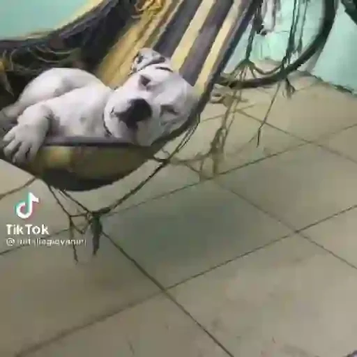 Um cachorro branco está deitado em uma rede com listras amarelas e pretas, olhando para a câmera com uma expressão relaxada. O fundo mostra um piso de azulejos e uma parede verde clara.