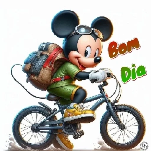 Mickey Mouse de óculos de sol, mochila e roupa verde, andando de bicicleta com o texto 'Bom Dia' ao lado.