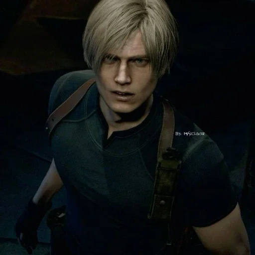 Personagem de jogo com cabelo loiro curto e expressão séria, vestindo uma camisa preta e alça de couro.