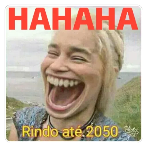 Uma mulher loira com expressão de muito riso, ao ar livre, com o texto 'HAHAHA' em vermelho e 'Rindo até 2050' em amarelo.